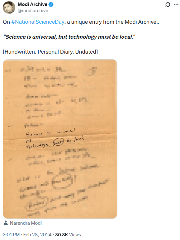 Prime Minister Modi’s words are not just slogans; they have been grounded in local contexts and have guided India’s digital strategy.[1] PM Modi has long believed that technology should be deeply rooted in local values and needs to solve real-life problems. A handwritten excerpt from his personal diary reinforces this view: “Science is universal, but technology must be local.” This reflects his belief that while scientific advancements are shared globally, technology becomes truly valuable only when tailored to specific local challenges.