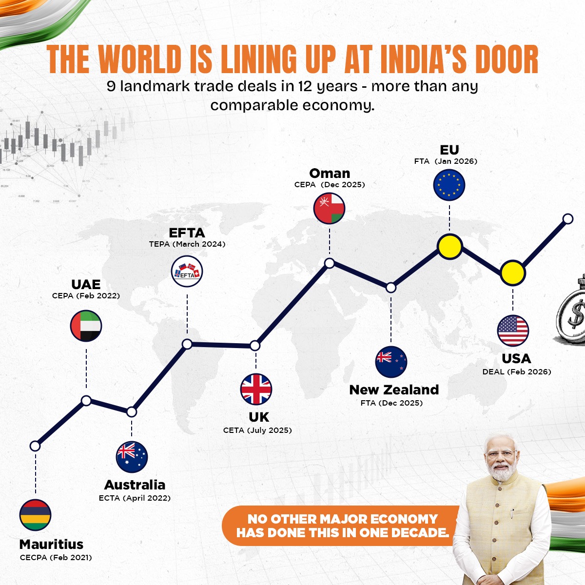 Nine deals. Six continents of reach. And the math is impossible to argue with, under the previous government, India had zero trade agreements with the developed Western world. Zero with the EU. Zero with the UK. Zero with the USA. Zero with EFTA. That changed completely.
