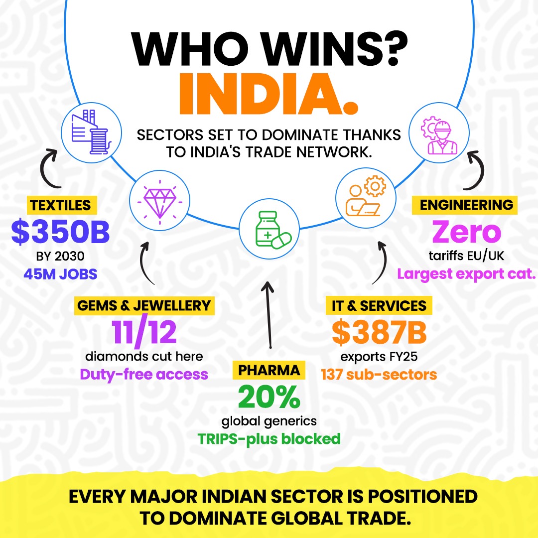 The EU deal is the big one and already got the attention for being “Mother Of All Deals”. Twenty-seven nations. 4.5 Crore people. The world’s largest single market. India got zero tariffs on $33 billion worth of textile, leather, gems, jewellery, and marine exports. 99% of Indian exports by value will have duty-free access. The EU sent both its Commission President and its Council President to India’s Republic Day — a dual honour that has almost no precedent. Europe chose India because India delivers. Scale, stability, and a government that follows through.